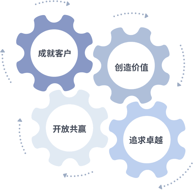成就客户是一切决策的出发点,,,创造价值是衡量所有工作的标准,,,追求卓越是我们做事做人的态度,,,,开放共赢是我们的格局也是最终的结果。。。价值观的齿轮环环相扣,,推动着组织里的每个人不断向前。。。。